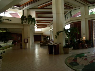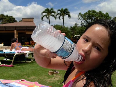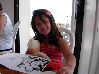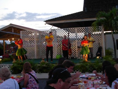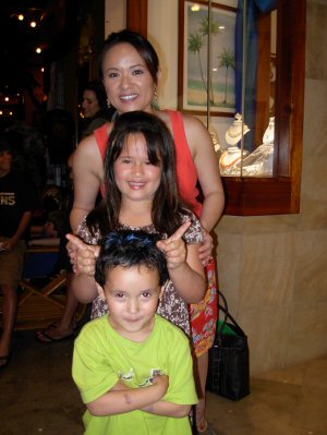 Zoe and Bigs at the Marriott Luau--Bigs starting to get itchy.