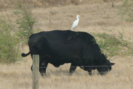 crane catching a ride on a black angus on the road to Lahaina.