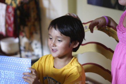 Zoe watches intently, hoping the little guy will hurry up and get to the cake.