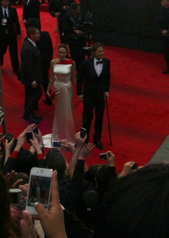 Zoe wtih Angelina Jolie & Brad Pitt being interviewed in the background.