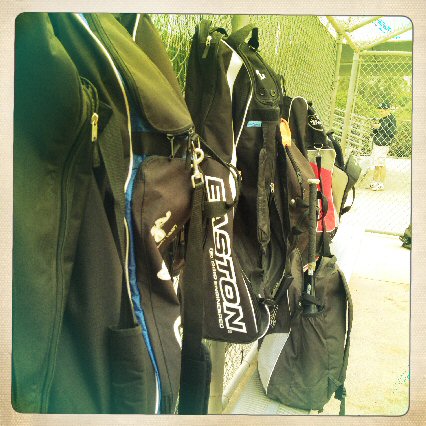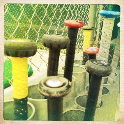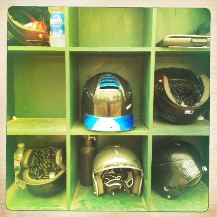 The Yankee helmets lie in wait until the next "batter up" is yelled.
