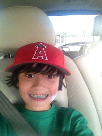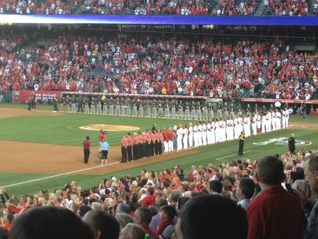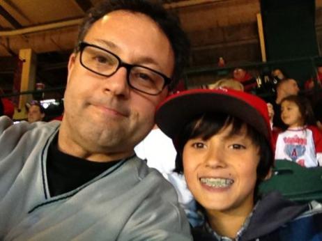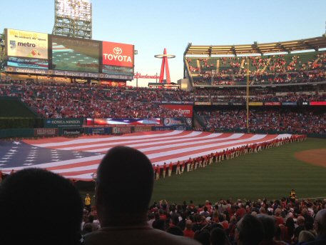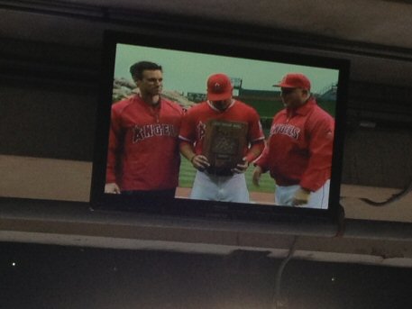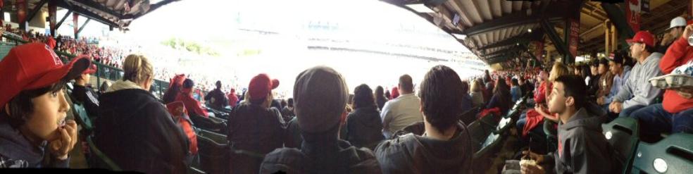 Here I am watching a key replay in section 208. I'm glad we upgraded our seats this season--we have a great view of Trout in left field.