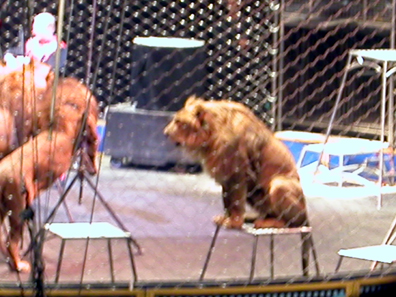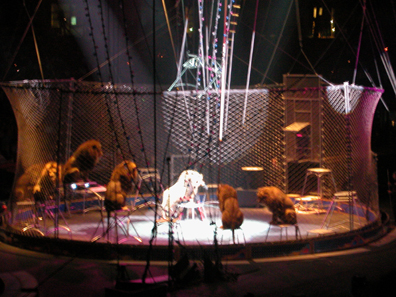 | This was the highlight of the evening--the stunt lions. Whenever I've seen a lion at the zoo, all they do is hang out on some rock and sleep. Not these lions, they were pretty nimble. |
