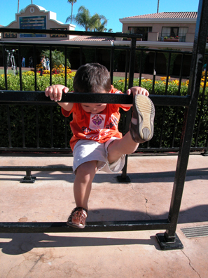 | Luckily, I spotted some railing by the winner's circle and turned it into a jungle gym. Aside from the smell and heat, Del Mar isn't half bad. |