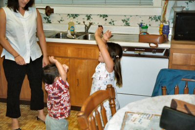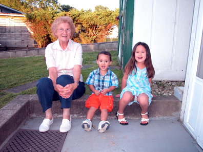 | Here we are with our Great Aunt Red. Wow, look how long Zoe's hair is (it's shorter now). Red took us down the street and gave us a tour of her house and back yard. More running. |
