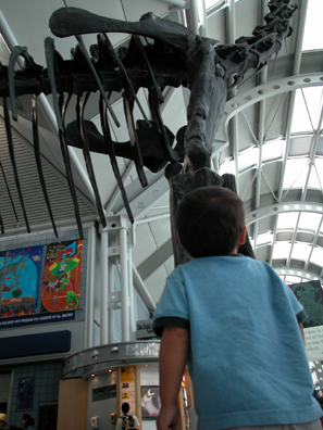 | On our flight home, we stopped in Chicago. I was pretty grumpy until I spotted this T-Rex skeleton in O'Hare. Wow, that's one big pet. |