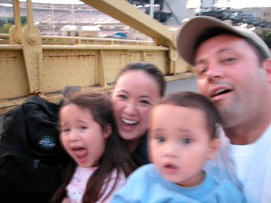| We left the game a bit early and took a rickshaw ride back to our hotel. Poor guy nearly died. Here we are going over the Roberto Clemente bridge and that's the stadium in the background. |