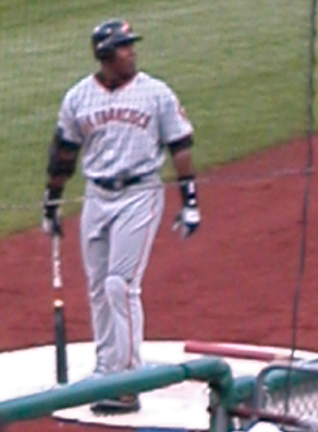 | Here's Barry Bonds getting ready to hit. Dad says he's not very nice but is a great player. He got a walk this time but a home run later on. |