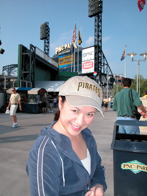 | Here's mom posing in dad's new Pirates cap. We walked around the stadium so that we could really check things out. Good hot dogs there! |