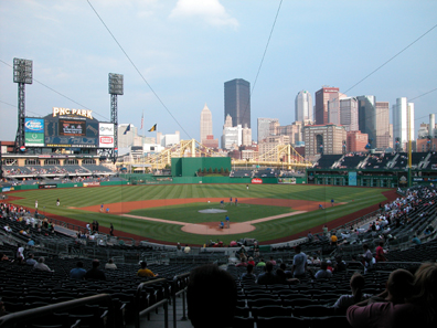 | We also got to attend a Pirates-Giants game at PNC Park. We had great seats, right behind home plate so I could really see all the players. Hey look, there's a whole city in the outfield. |