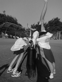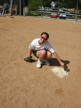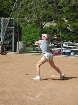 | And then it was game time. Here's one of our many rookies, Debbie, taking a swing. |