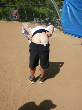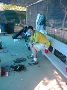 | Dave Oskorus dutifully prepares for the "worst two minutes of Sloshball" in the cool blue environs of the visitor dugout. |