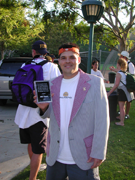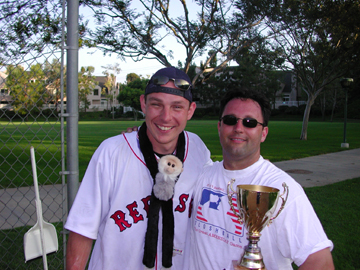 | The festivities closed out with the awards ceremony, with medals going to The Homer Champ: Jeff Templeman, The Rookie of the Year: Jim Young, The Best Play: Ian McClelland and The MVP: Kevin Dryzga. And then this year's suspense ended with the induction of Milo Chavis into the Sloshball Hall of Fame. Way to go, El Guapo!! |