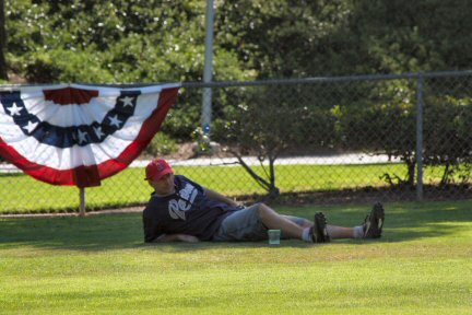 Gary relaxes in deep left while his teammates try to pull it together.
