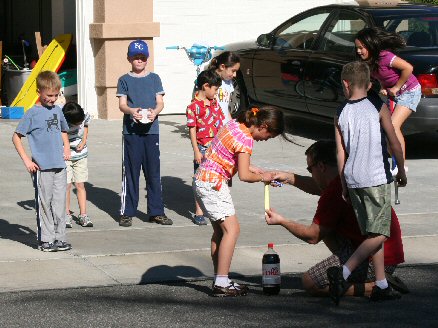 Here's our scooter gang watching a Coke-Mentos experiment in action.
