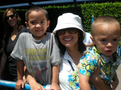 Quinlan, Anhthy and Brennan, waiting in line at Legoland.