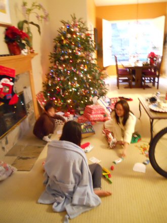 Hanging out on Christmas morning opening up gifts.