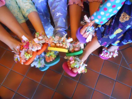 Alexis stitching together some flip flops--mom's always very crafty.