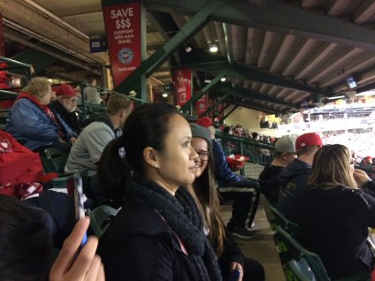 Peeking around mom at an Angels game to see what Ryan is up to.